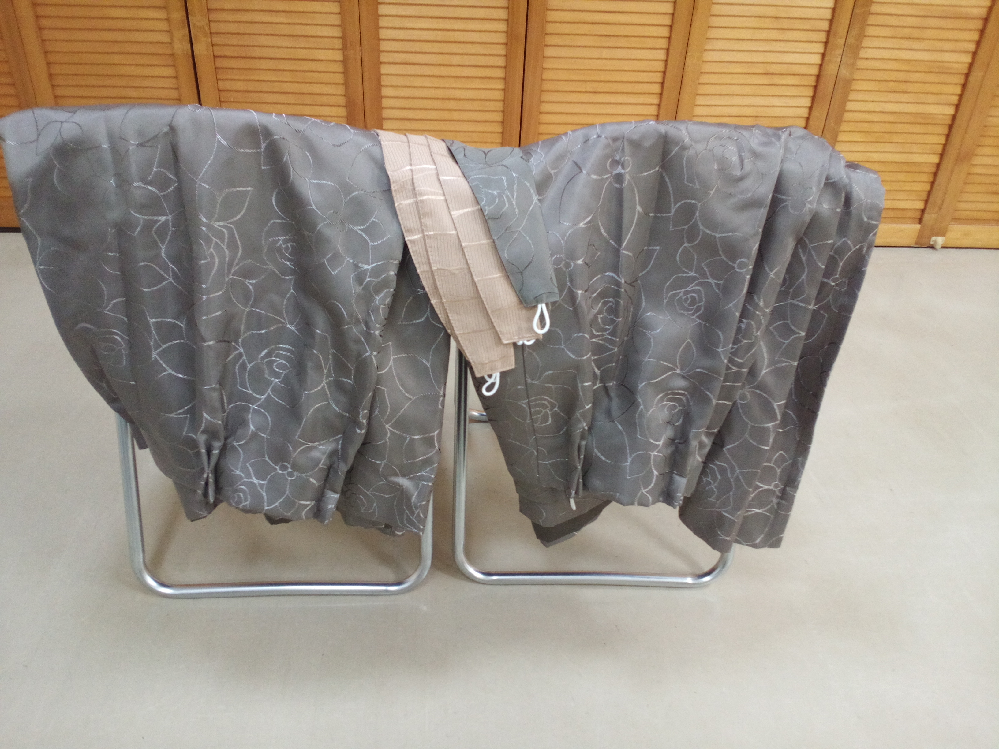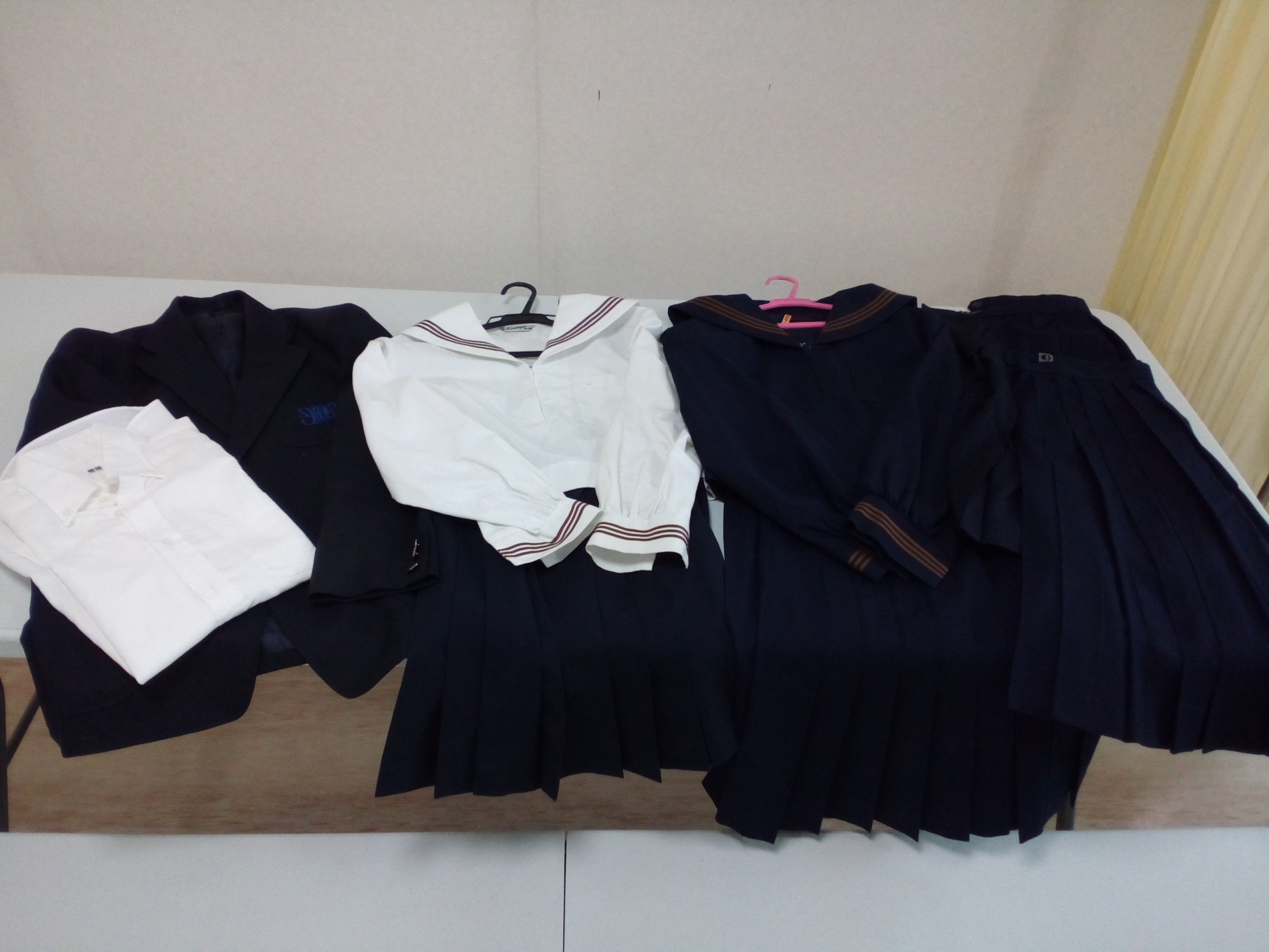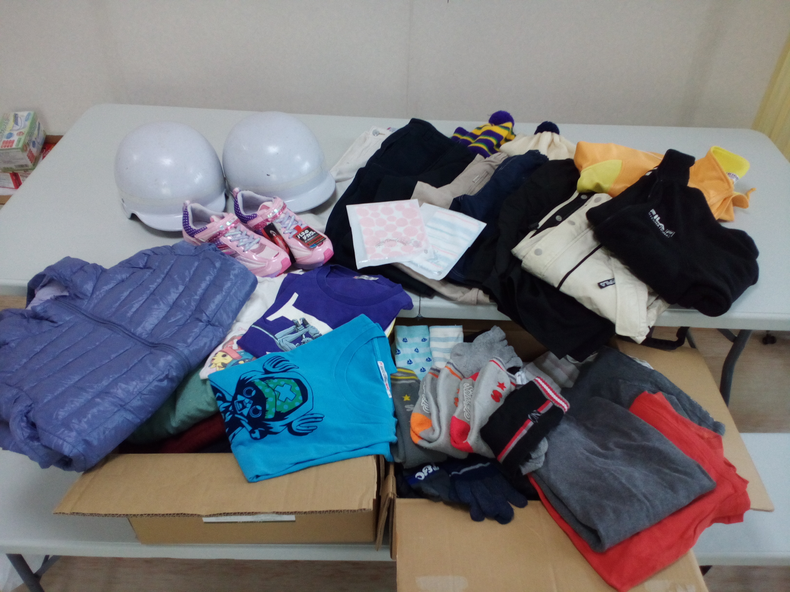 通学用ヘルメット、スニーカー、たくさんの洋服。