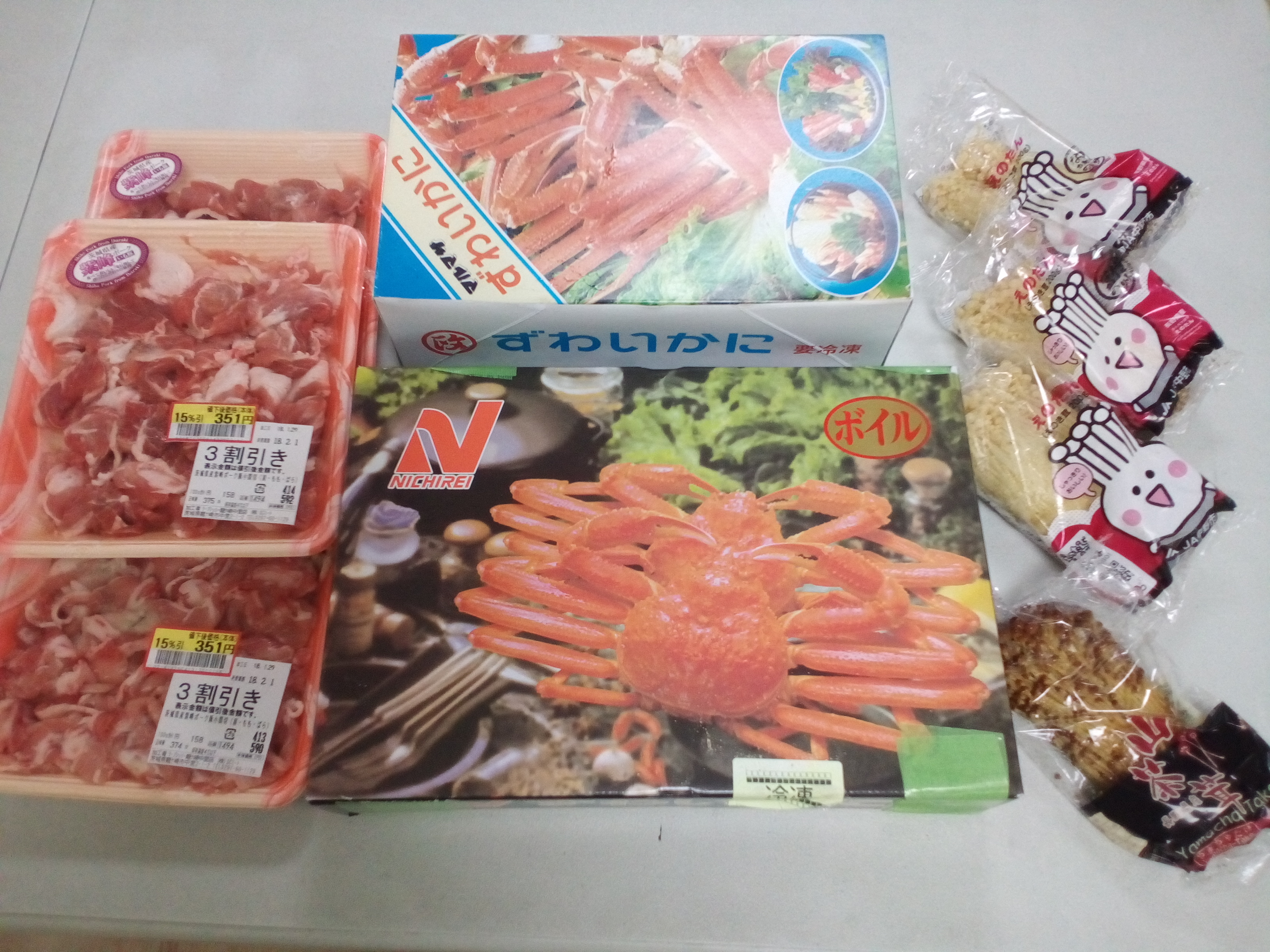 ズワイガニ、豚肉、エノキダケ