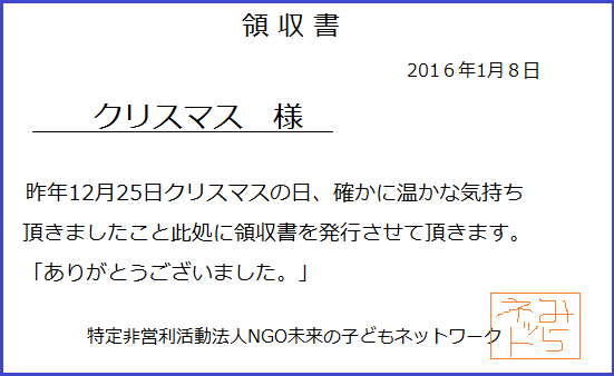 が、クリスマス様の住まいが判らないので、ここに領収書を