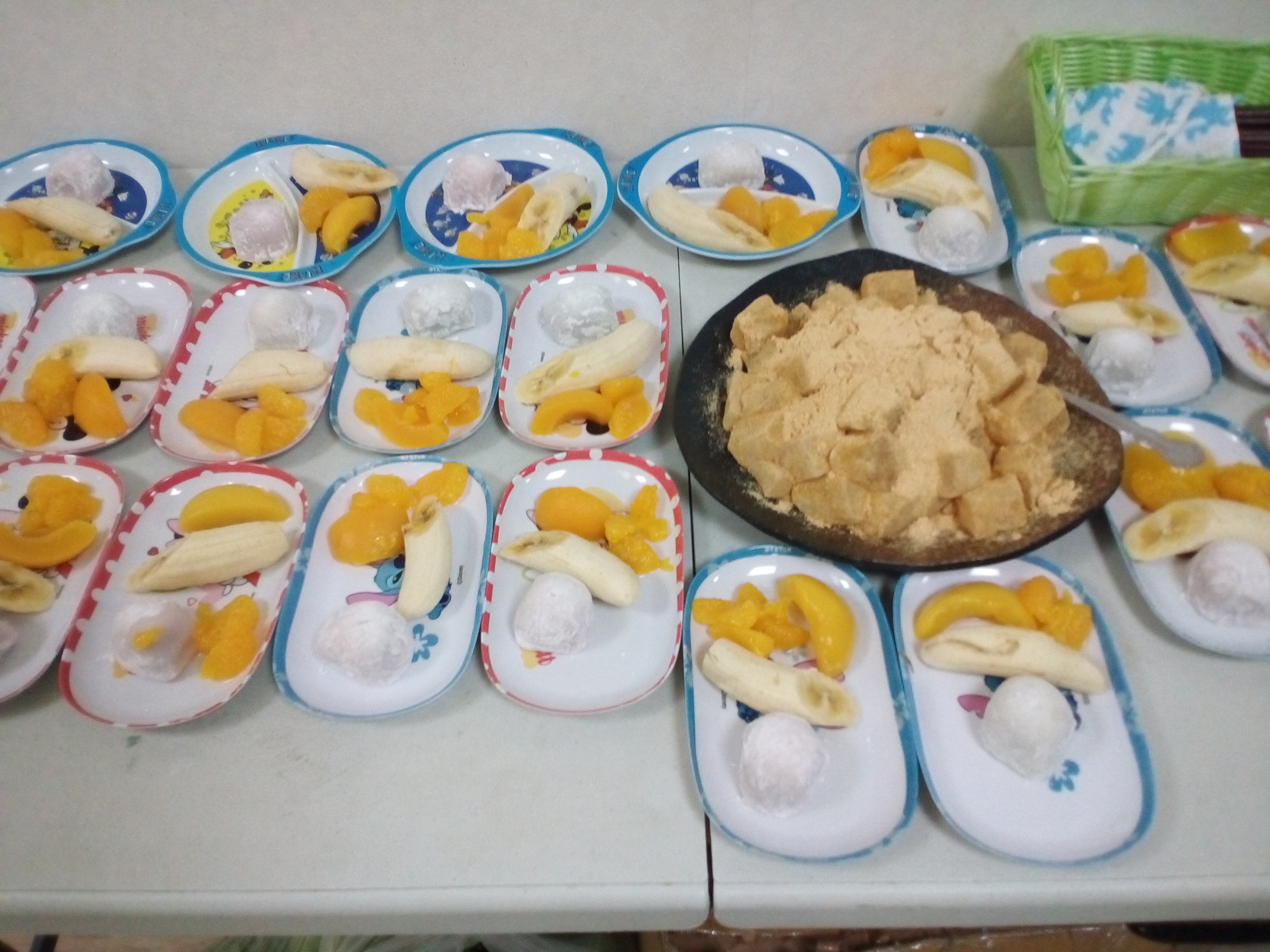 バナナ・みかん・黄桃・大福が盛られた皿に