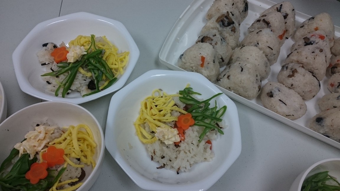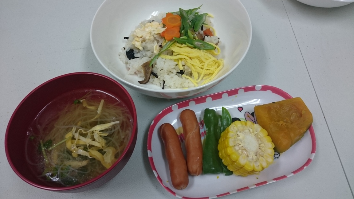 五目ごはん、ウインナーと野菜のソテー、かぼちゃの煮物、冷製お吸い物他