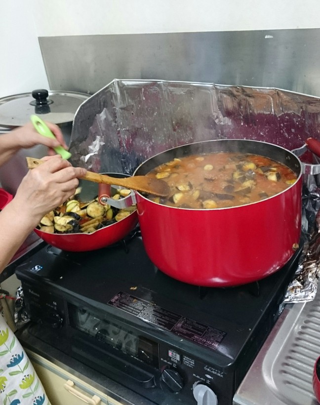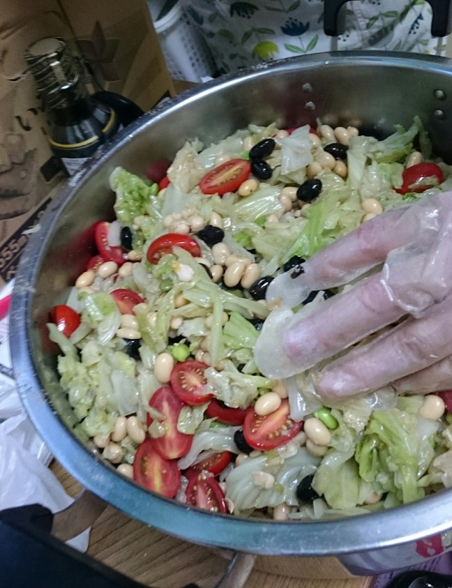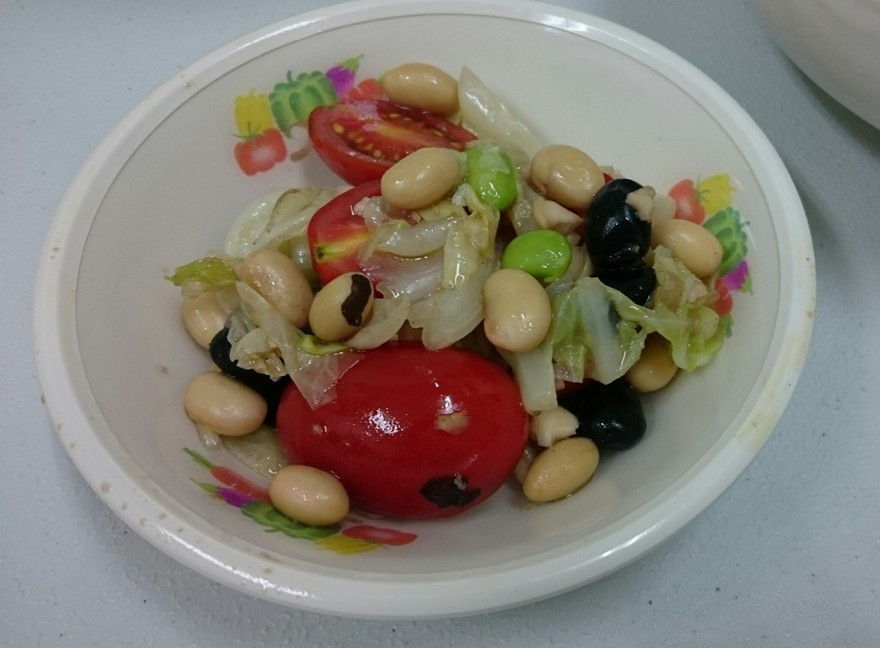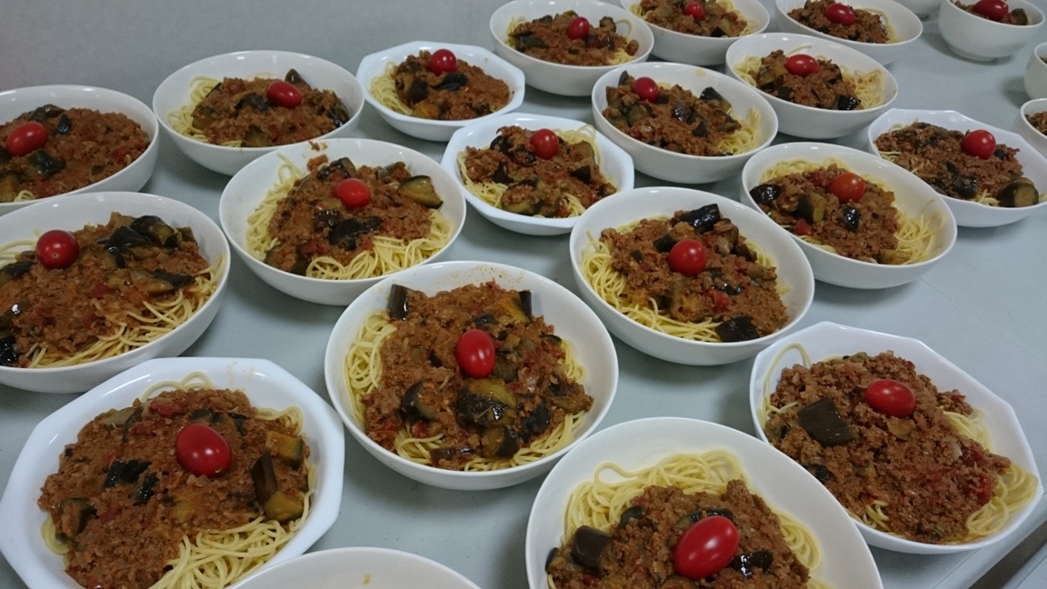 ミート茄子パスタ、豆入り夏野菜サラダ、ポテト、きゅうりの漬物その他