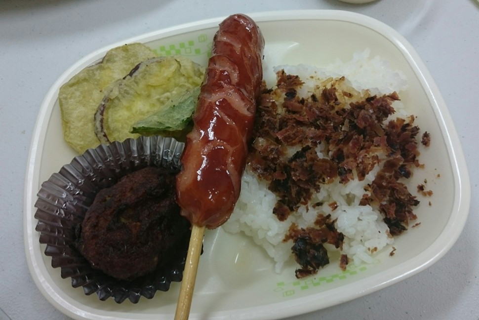 お芋の天ぷら、大豆をマッシュした揚げもの、フランクフルト