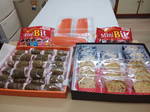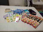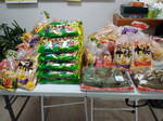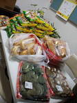 バナナと大根、たくさんの菓子パンと柏餅・チョコレート、そして文房具。