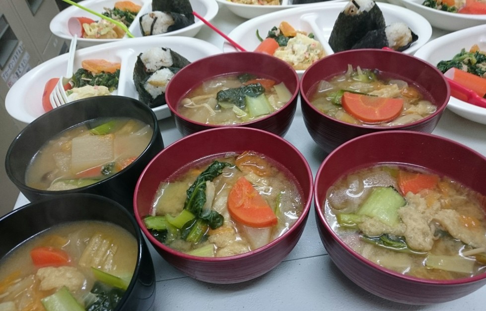 このおみそ汁には大根、小松菜、白菜、にんじん