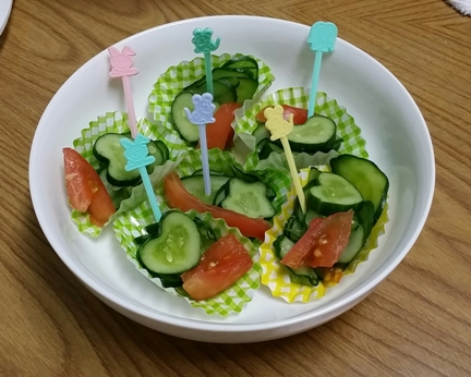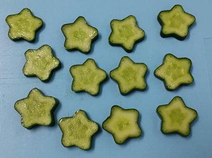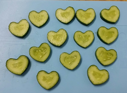 無料塾は7時頃になると夕食タイムになります。もちろん、勉強の中断が長くならないように、食事時間は限られています。子ども食堂の調理スタッフたちは、限られた時間と限られた食材で工夫をして子どもたちに美味しい食事を提供しています。七夕の日にはにんじんを星形に型抜きしました。直径1.5㎝位の小さな星型でした 星型やハート型のデコきゅうりも登場します。野菜嫌いの子どもたちに喜んで食べてもらいたい!そんな想いで作ったきゅうりです。 英語で、涼しげで冷静なことを 「as cool as a cucumber 」と言うそうです。こどもたち、涼しくなってくれたかな♪by jasmine