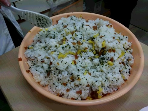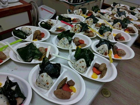 おにぎりの具材は黄色のたくあん、わかめ、たくあんの味噌漬け
