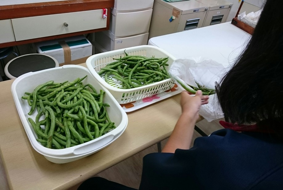 いんげんは中学2年生のRちゃんが下処理(ヘタ落とし)を