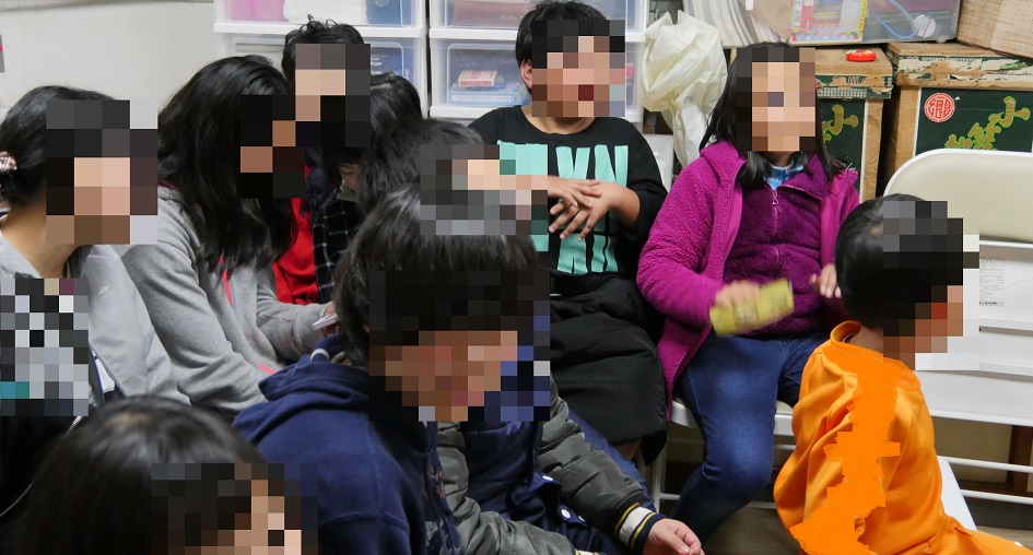 並んでお菓子つかみ取りを楽しんでいます。企画とプレゼントを持参