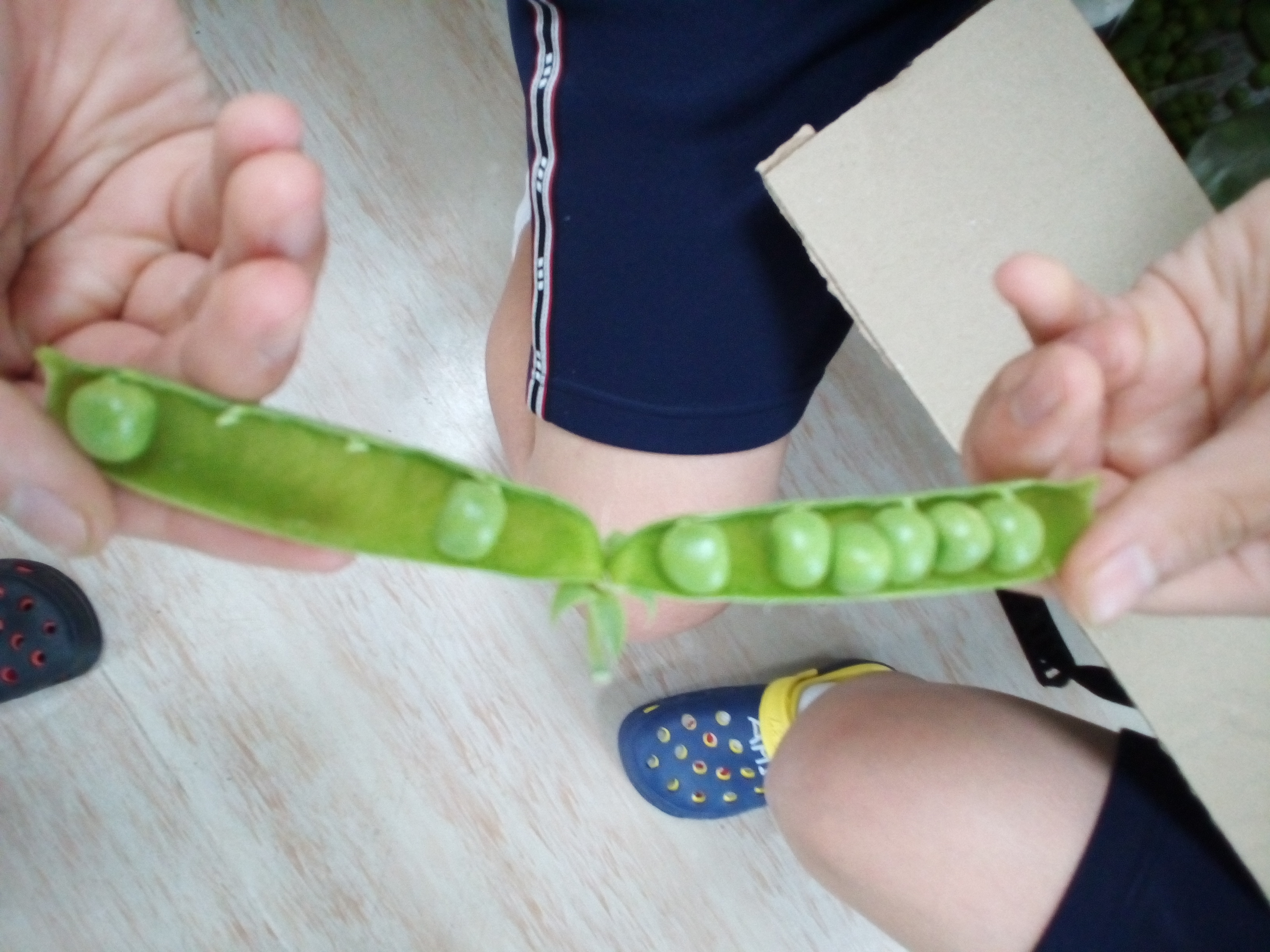 箱いっぱいのグリーンピースは、女の子達がさやから取るのを