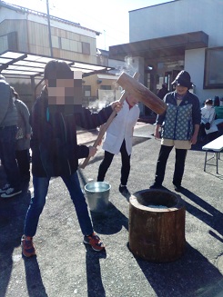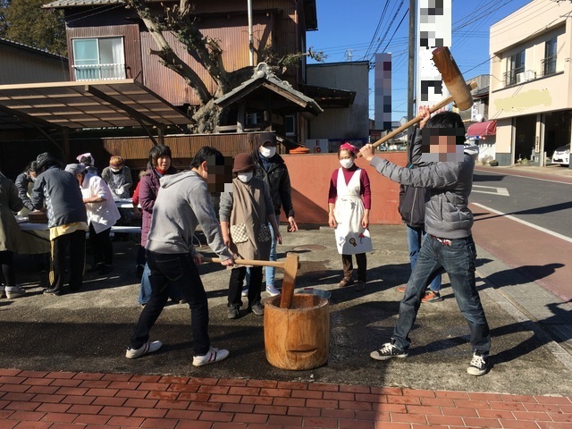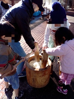 子どももおとなも、杵と臼のお餅つきを体験して、
