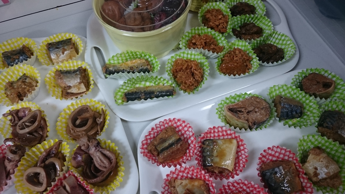 塩おむすびにして、ご支援で頂いた缶詰め、瓶詰めから