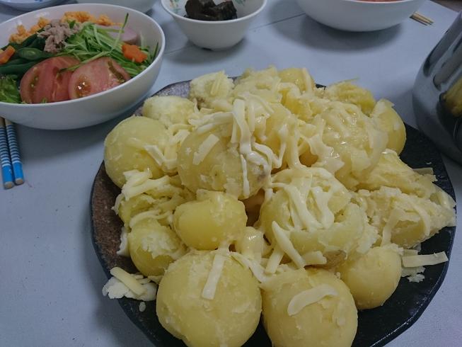 炊飯ジャーで蒸したジャガイモにバターやチーズをのせました。