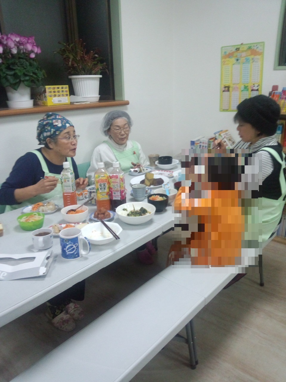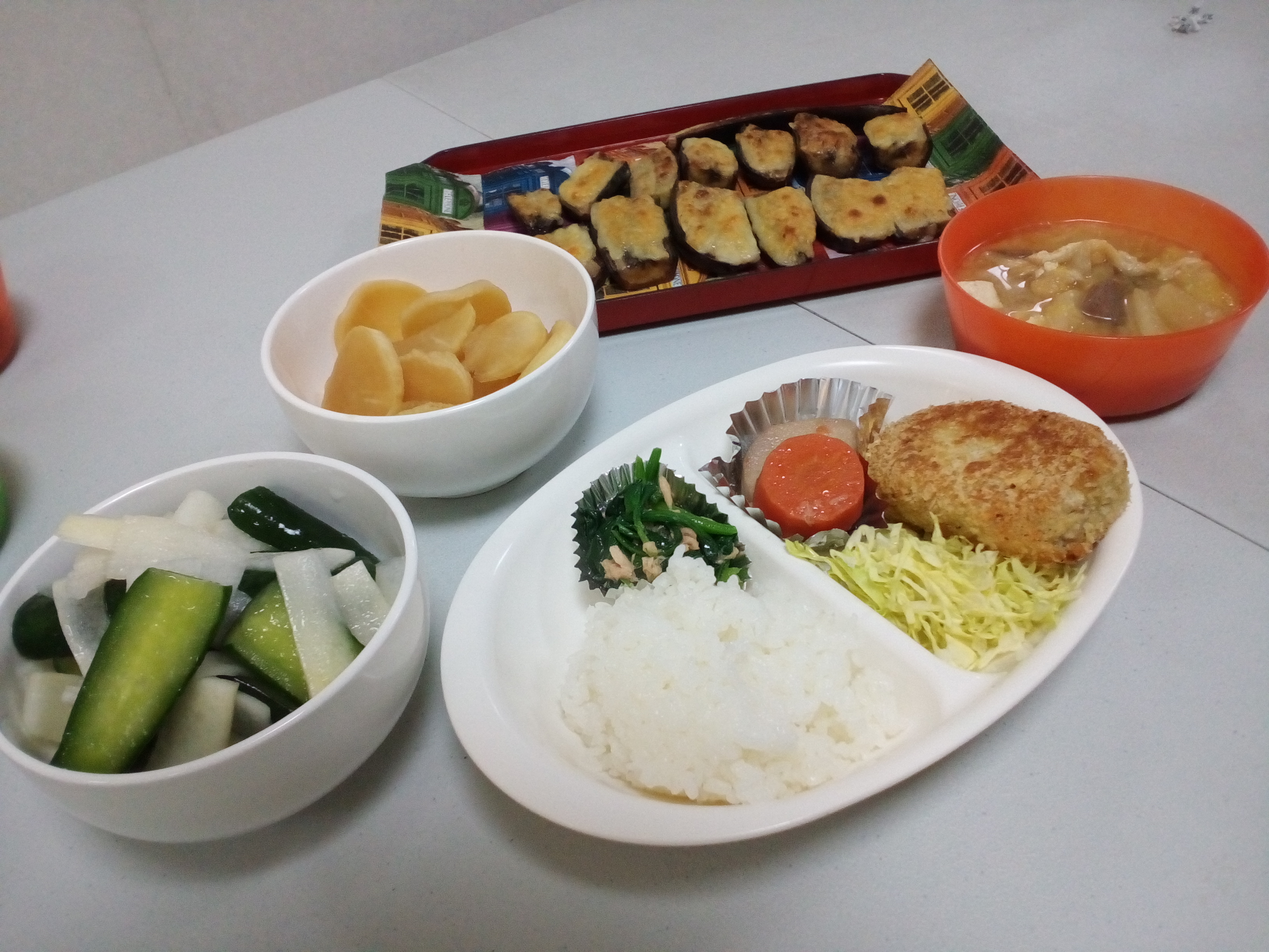 青菜の和え物、具だくさん味噌汁、あとひく~干しいも)