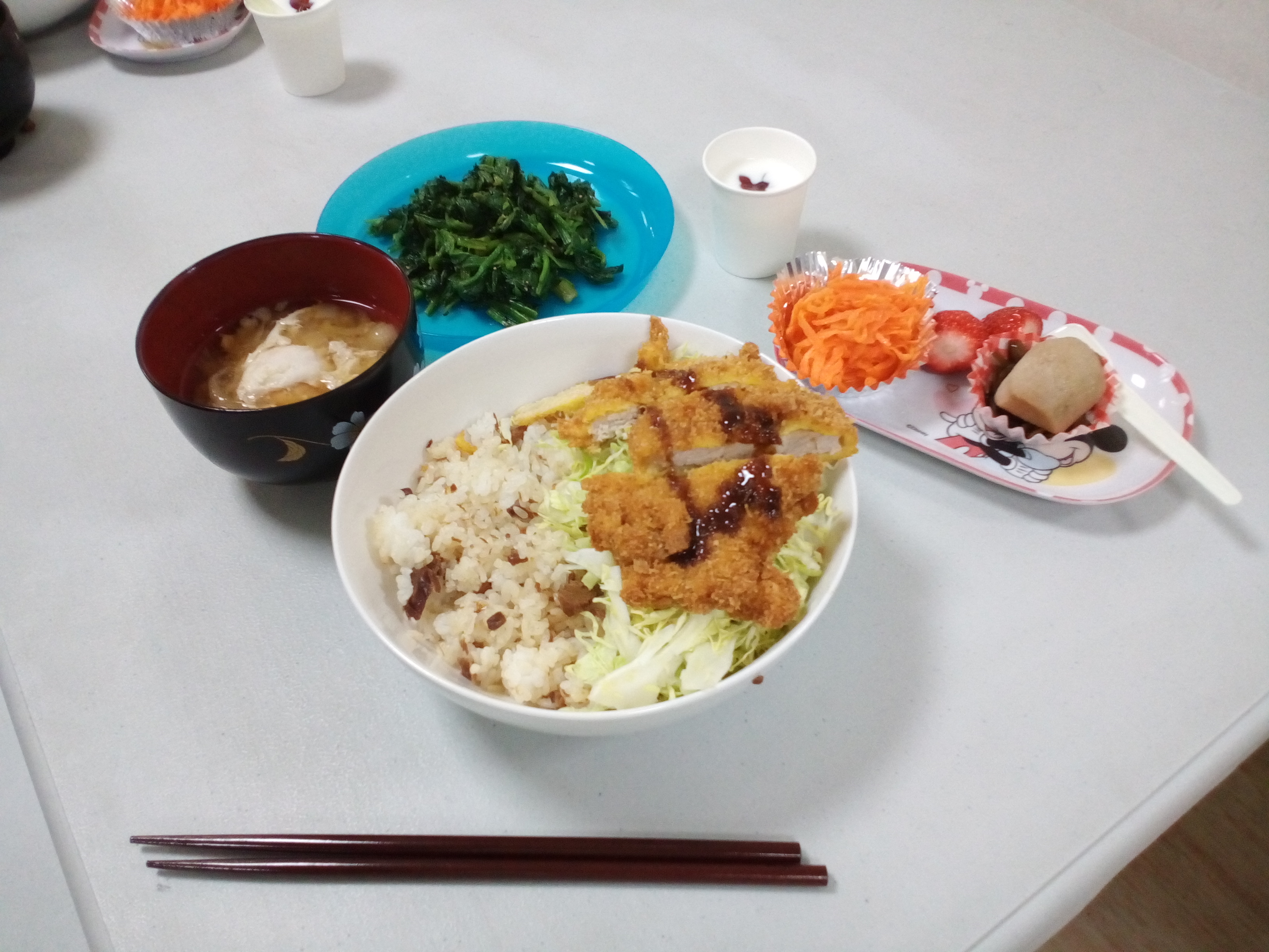 (2月16日は、とんかつ丼、具だくさん味噌汁、青菜の和え物、