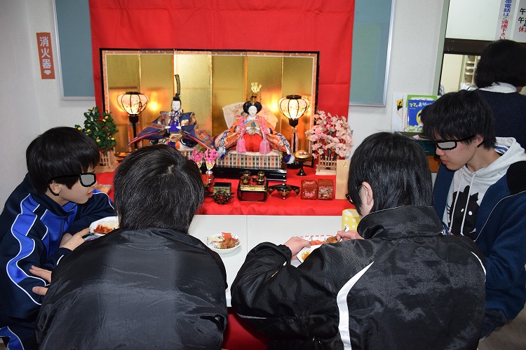 不図見ると、お雛様の前で思春期男子4人組が固まって